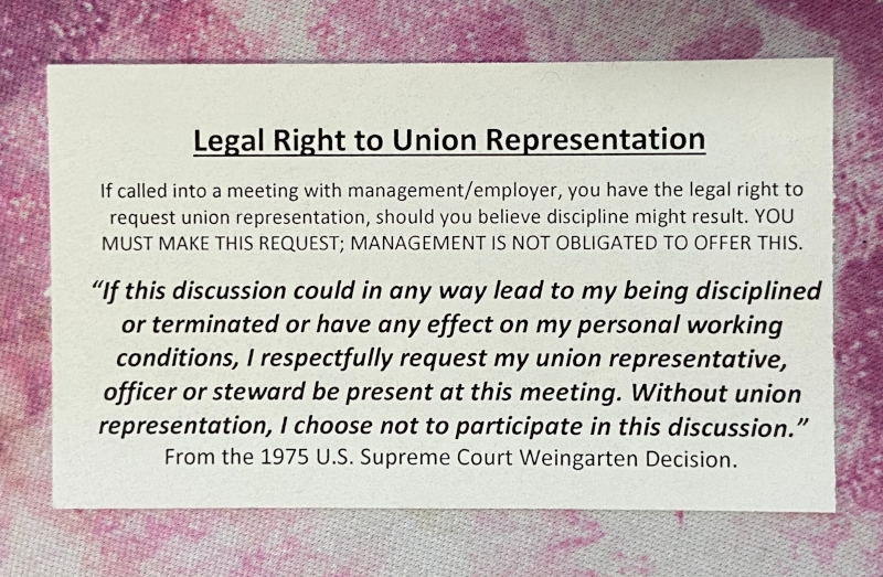 Weingarten Rights Card : Weingarten Rights Card For Union Locals Trenton Nj. And (2) the employee has a reasonable belief that discipline or other adverse consequences may result. Cut at thick solid lines. Employees have weingarten rights during investigatory interviews. These rights, established by the supreme court, in 1975 in the case of (nlrb vs. What is an investigatory interview?